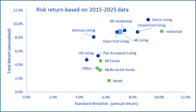 Over the past 10 years, the Living Fund Index delivered an attractive risk-return profile, outperforming the wider Fund Index—including office and retail funds. While industrial/logistics funds posted slightly stronger returns, their returns were more volatile.