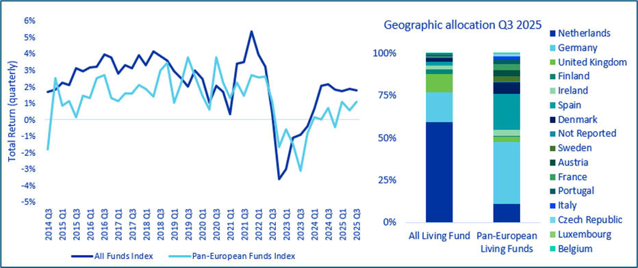 The Living Fund Index includes a mix of single country funds, pan-European and other multinational funds, giving investors a wide lens on the market. The Netherlands stands out with the longest performance history dating back to 2001, demonstrating the maturity of the Dutch market with 9 pooled institutional funds representing a combined GAV of €34.9 billion of the Living index’s total €60.4 billion in Q3 2025. Germany follows with 8 funds and a combined GAV of €8.8 billion, followed by the UK with 4 funds and a combined GAV of €6.4 billion.
