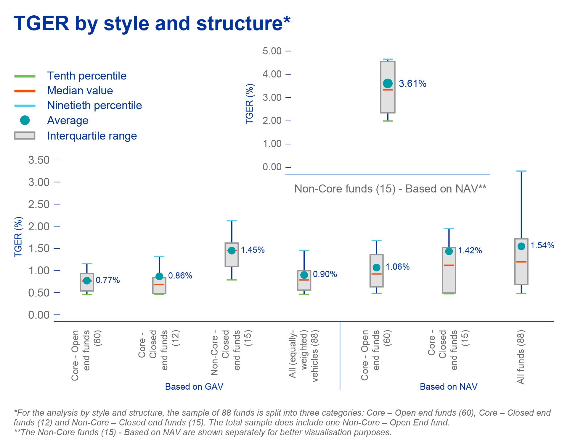 - Within Core funds, ODCE vehicles reported higher TGERs at 1.00% on GAV, compared to 0.72%, but showed lower TGERs than the set of Multi country – Multi sector funds, which averaged 1.38% on GAV