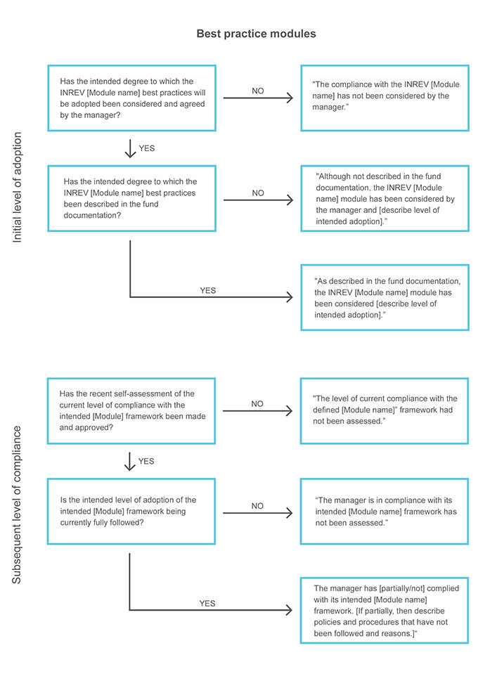 Managers should evaluate the level of adoption of INREV best practices using the Sustainability INREV Assessment Tool. Managers and investors should refer to and consider adopting INREV Sustainability best practices when designing and implementing an oversight framework for a specific vehicle. Managers should describe in their annual report and vehicle documentation their sustainability practices and the degree to which they adopt INREV best practices. Management and non-executive officers should review the adequacy of the description of the sustainability framework.